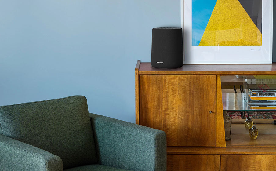 The stylish Harman Kardon Enchant Wireless Speaker lets you forget the world around you, surrounding you with the music you love thanks to its up-firing drivers and Dolby Atmos® Music. You can place it anywhere in the room and the compact speaker will automatically calibrate itself to deliver spacious, room-filling sound. Since it works seamlessly with AirPlay, Alexa MRM, Chromecast built-in™, and Spotify Connect, you can enjoy the immersive experience of Dolby Atmos® Music no matter where you create your playlists. And the quality of the Enchant Wireless Speaker audio is matched by its sleek, minimalist design—crafted in part with recycled materials—which looks great in any space.