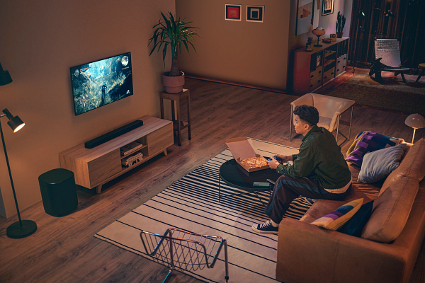 Flat TVs give you flat sound. So leave the screen to the TV experts and trust your ears to us: the audio experts. Enjoy crystal-clear dialogue, Dolby Atmos® surround effects, and a wide soundstage that elevates your entertainment experience. Plus an extra jolt of deep, punchy bass thanks to a wireless 10” subwoofer that adds more excitement to your games and more groove to your favorite music from hundreds of streaming services. And it works seamlessly with every brand of TV. Level up your sound game.