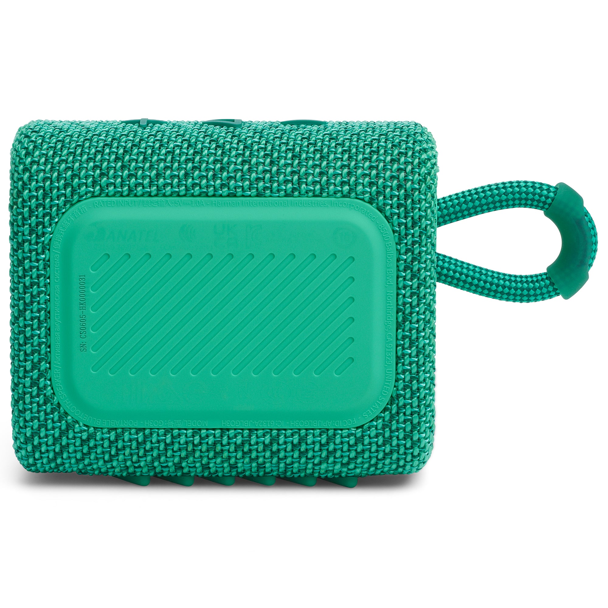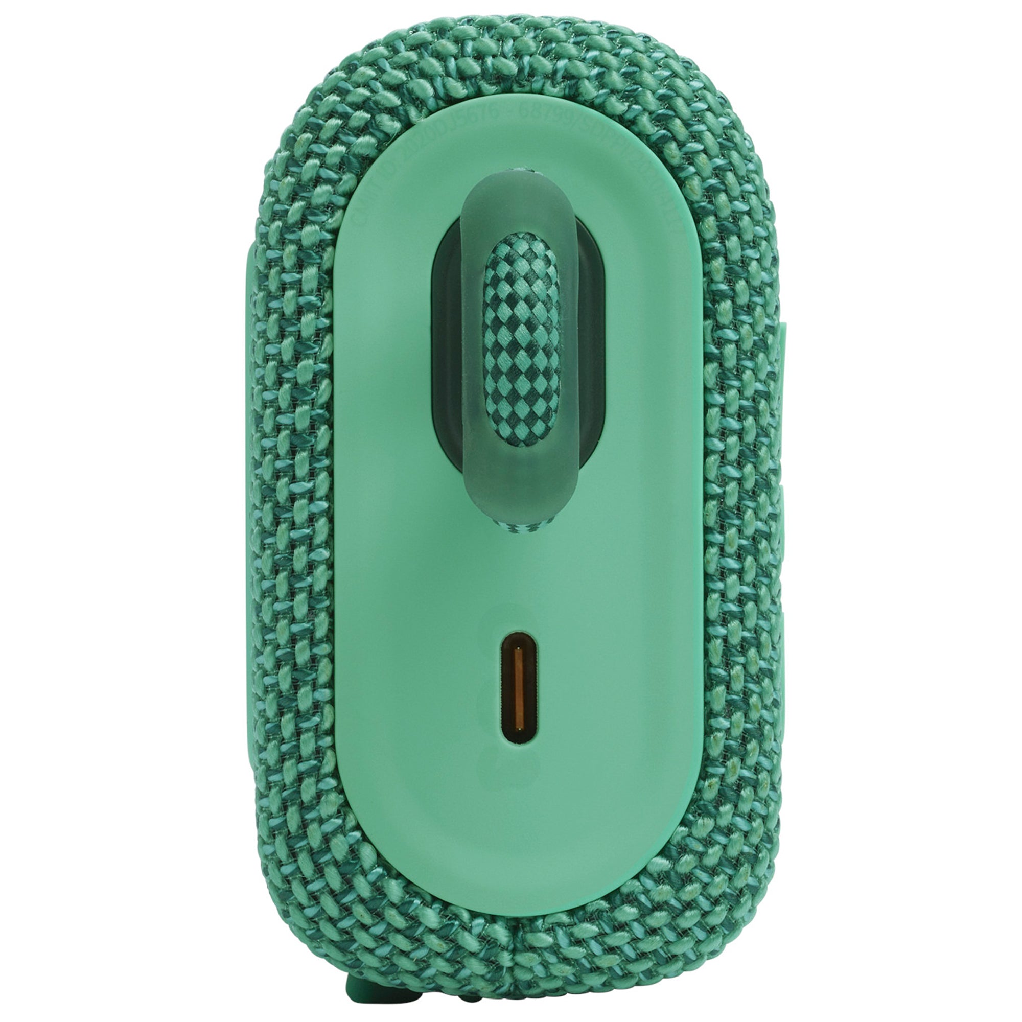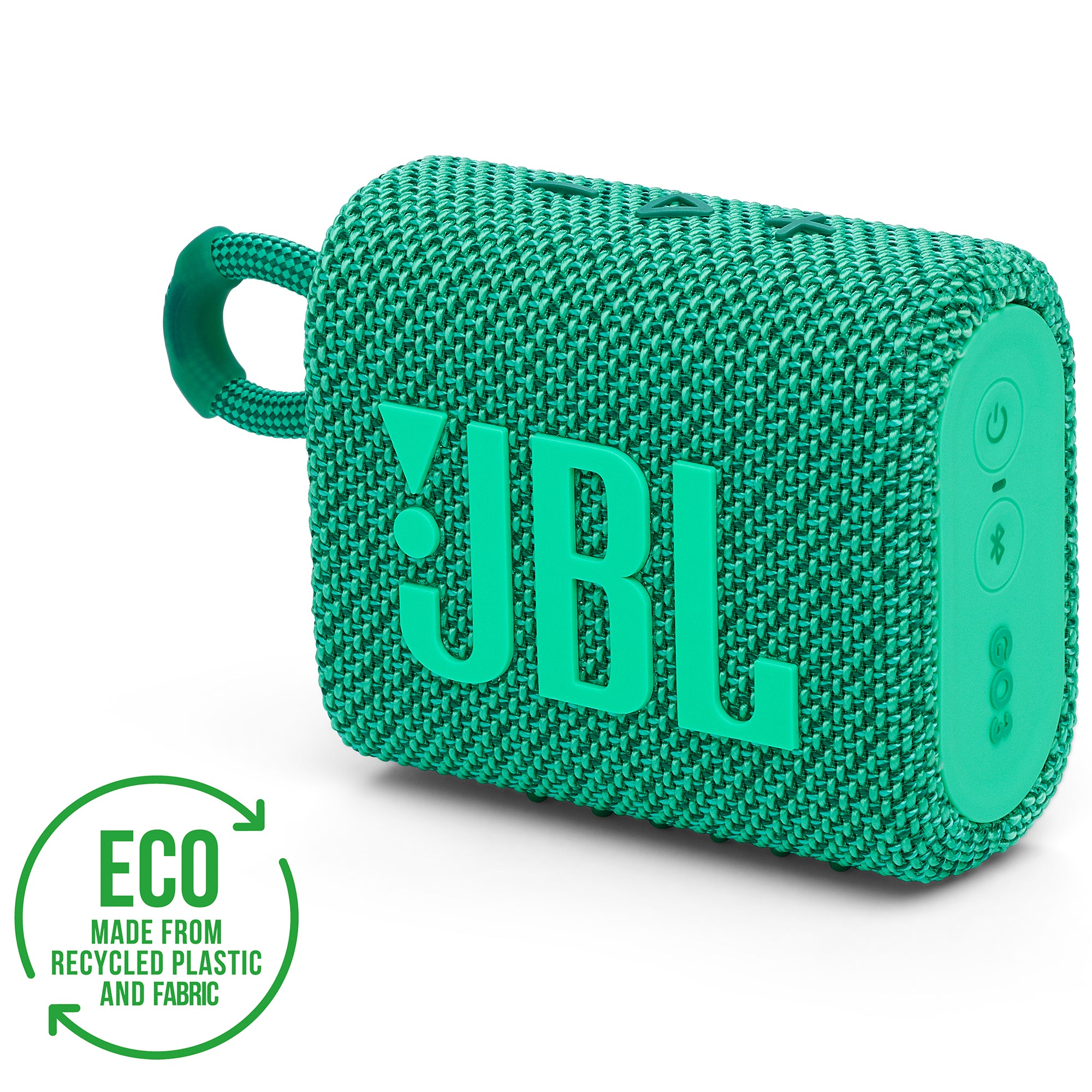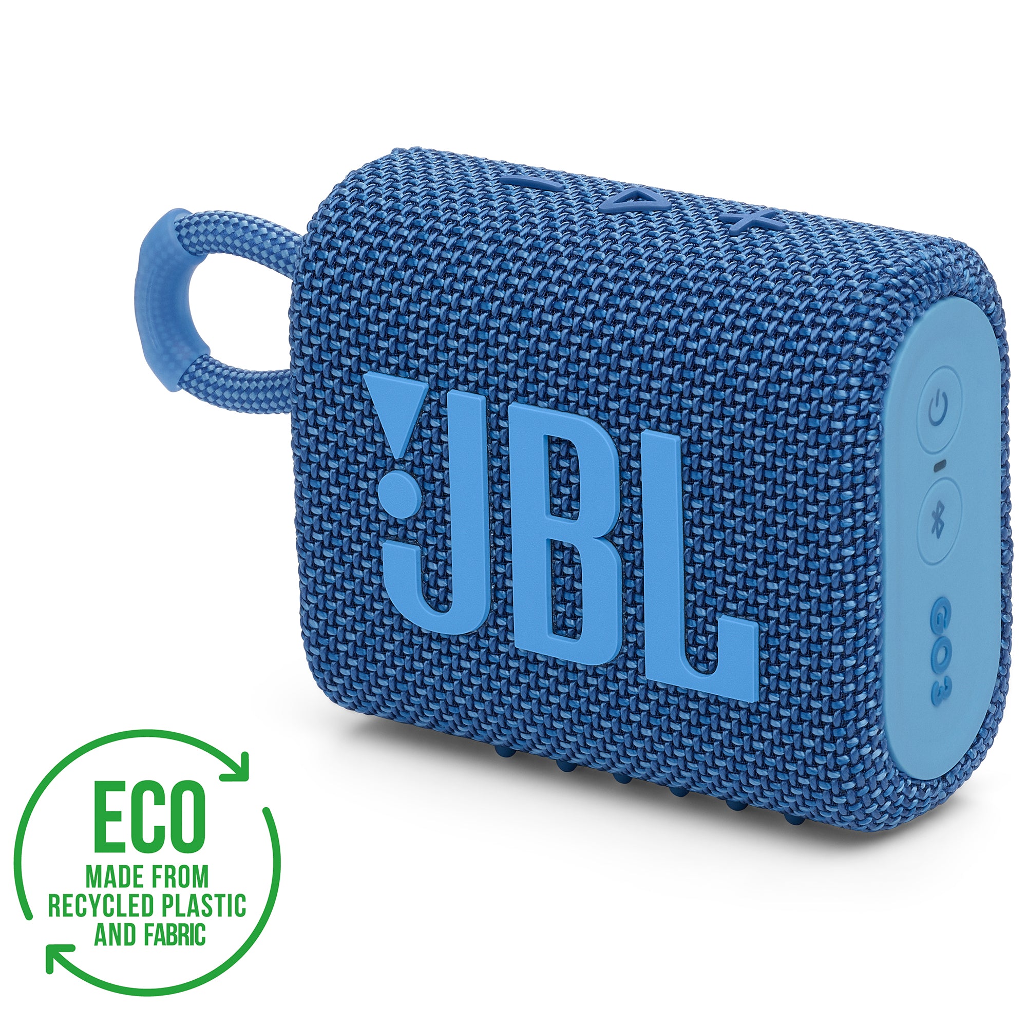 New innovative, eco-friendly design—same big audio performance. Help make the world a little greener with a must-have accessory for your next outing, made from up to 90% post-consumer recycled plastic and wrapped in 100% recycled fabric on the speaker grille. The JBL Go 3 Eco looks as vivid as it sounds with bold styling, expressive, edgy details, and rich JBL Original Pro Sound. The waterproof and dustproof design also features an integrated loop, so you can take your music anywhere, rain or shine, sustainably.