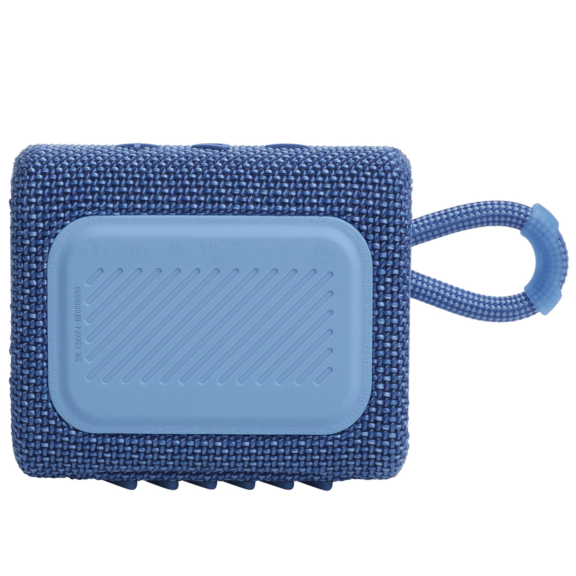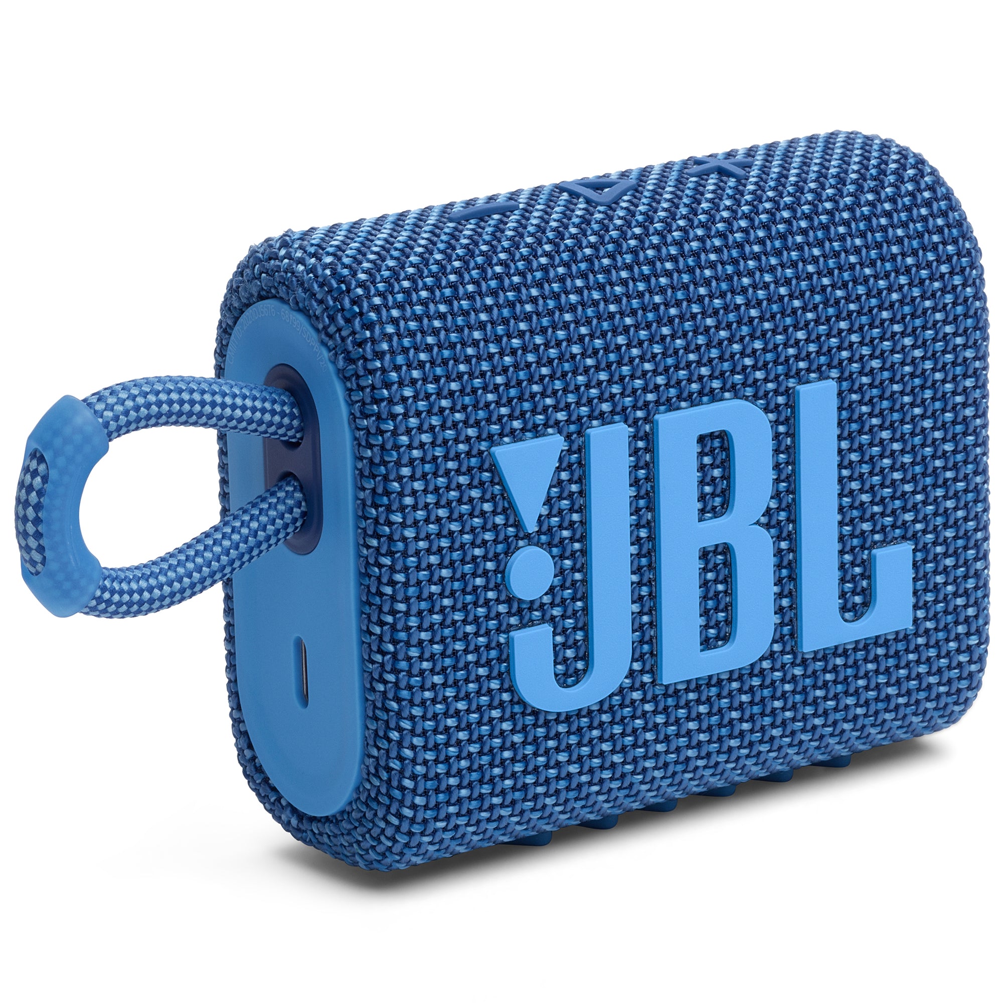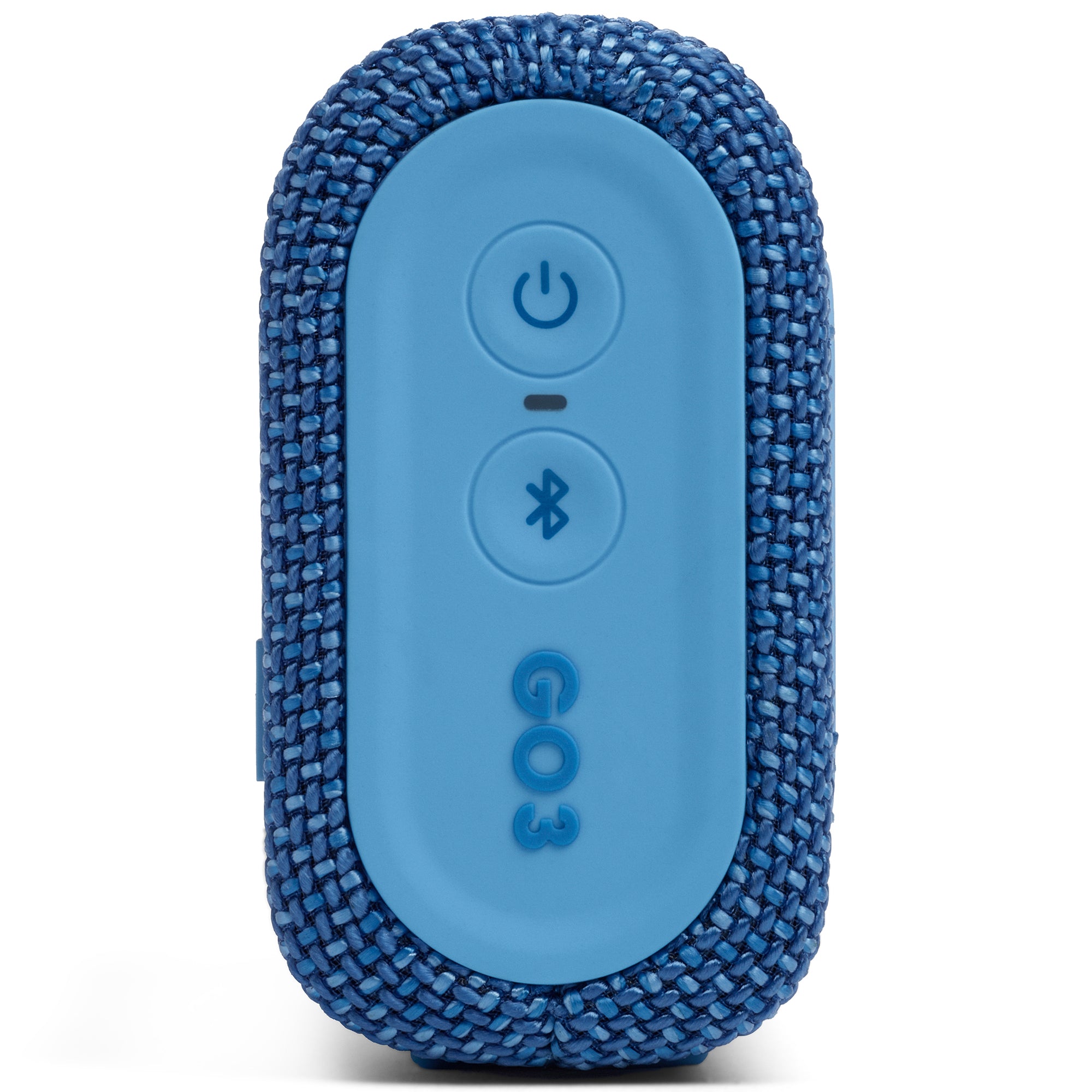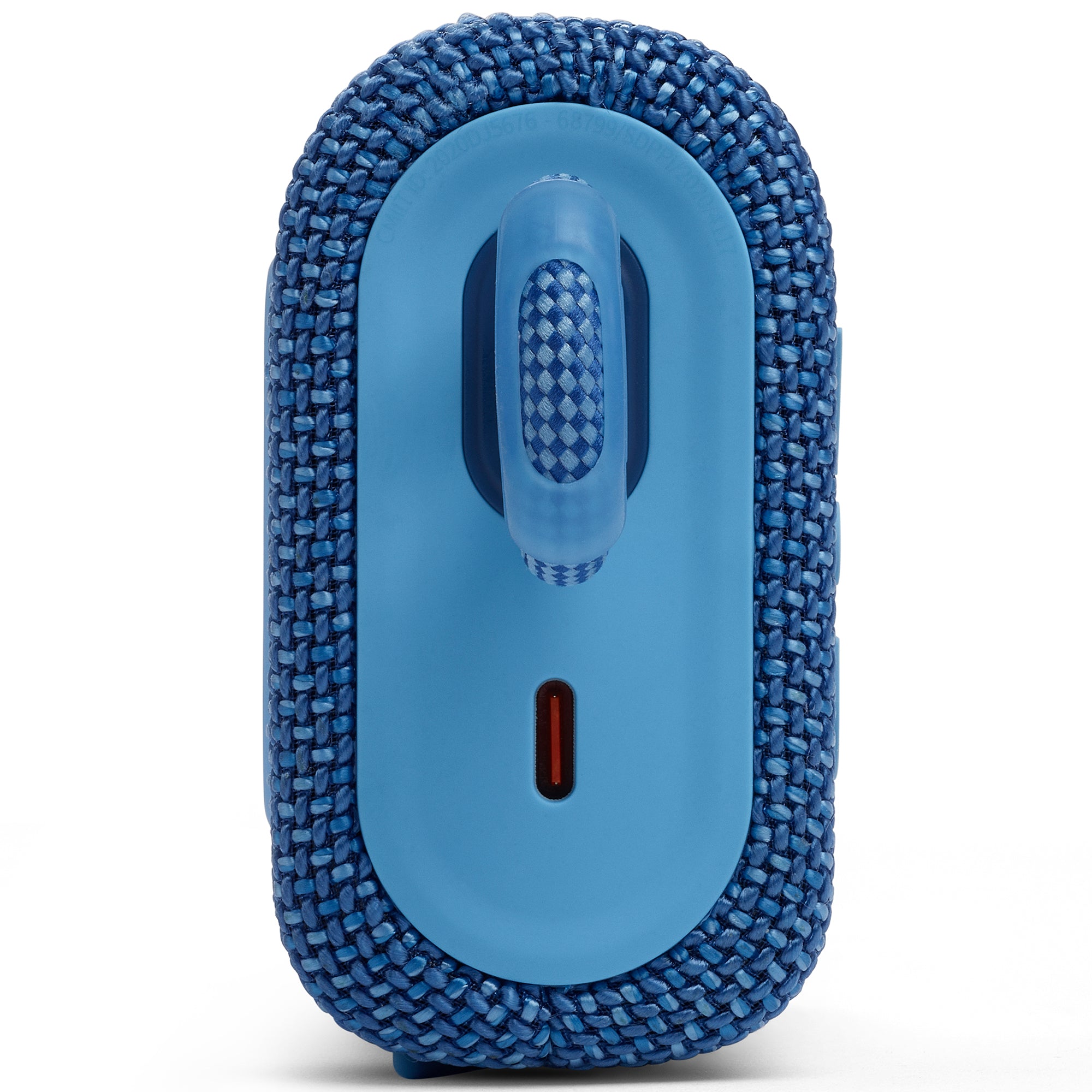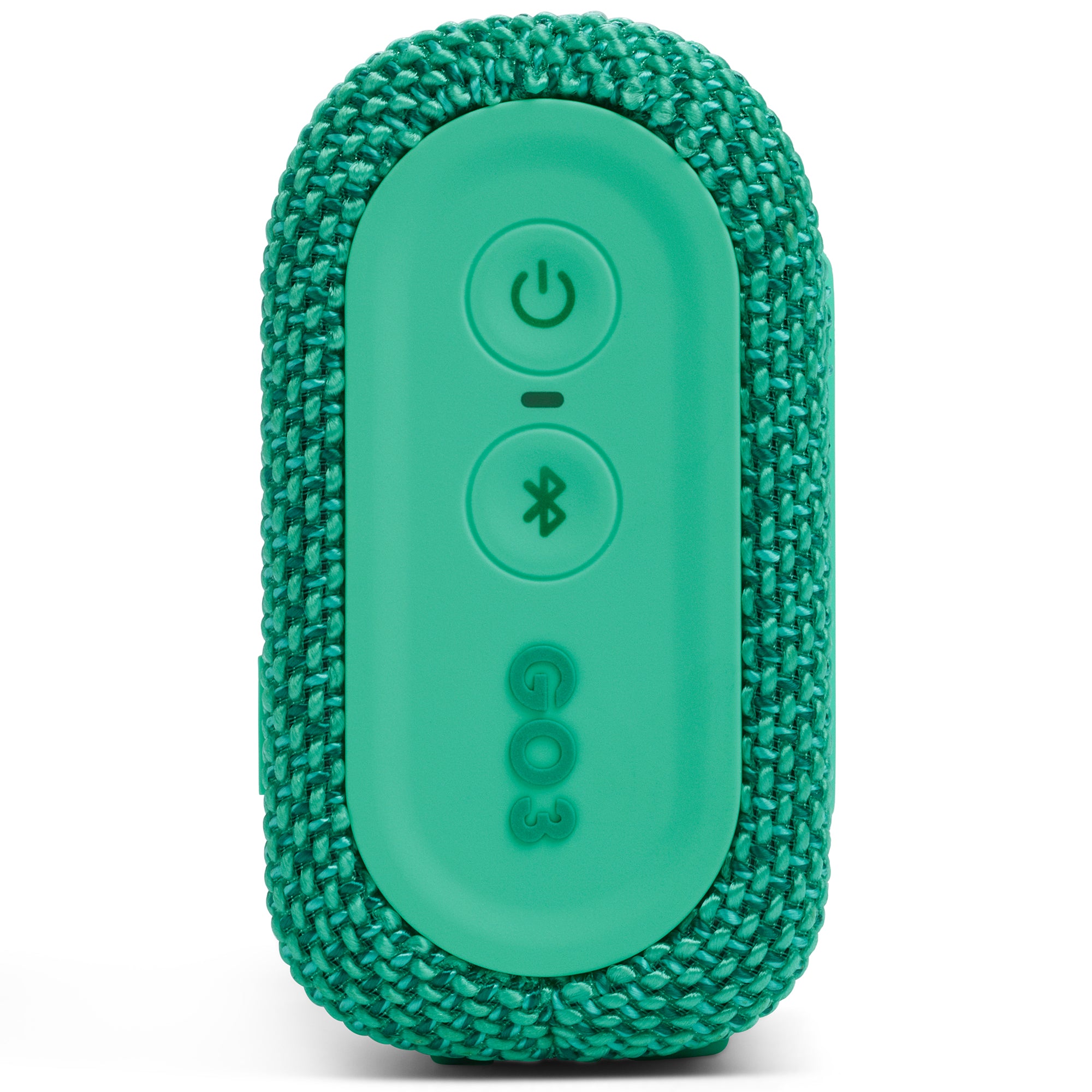 New innovative, eco-friendly design—same big audio performance. Help make the world a little greener with a must-have accessory for your next outing, made from up to 90% post-consumer recycled plastic and wrapped in 100% recycled fabric on the speaker grille. The JBL Go 3 Eco looks as vivid as it sounds with bold styling, expressive, edgy details, and rich JBL Original Pro Sound. The waterproof and dustproof design also features an integrated loop, so you can take your music anywhere, rain or shine, sustainably.